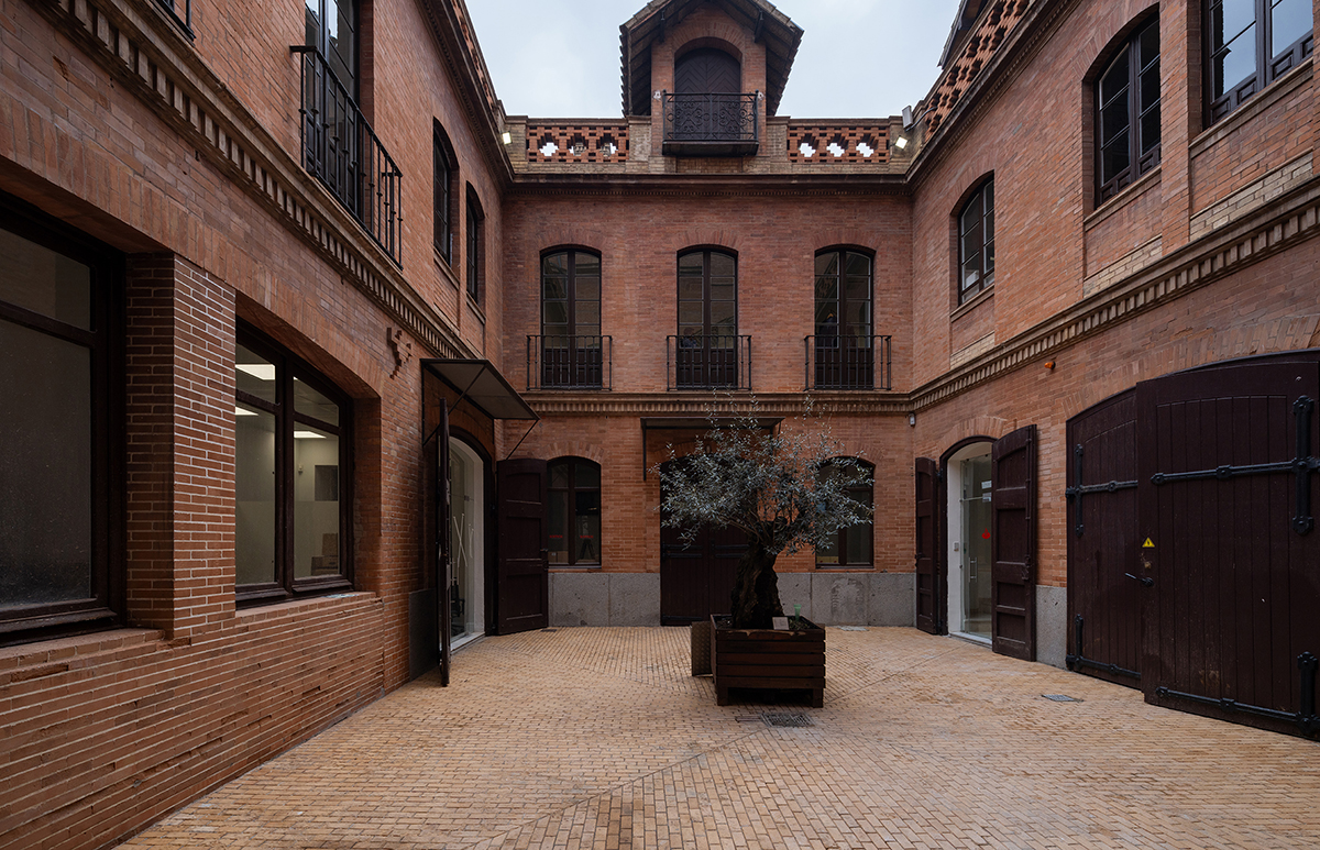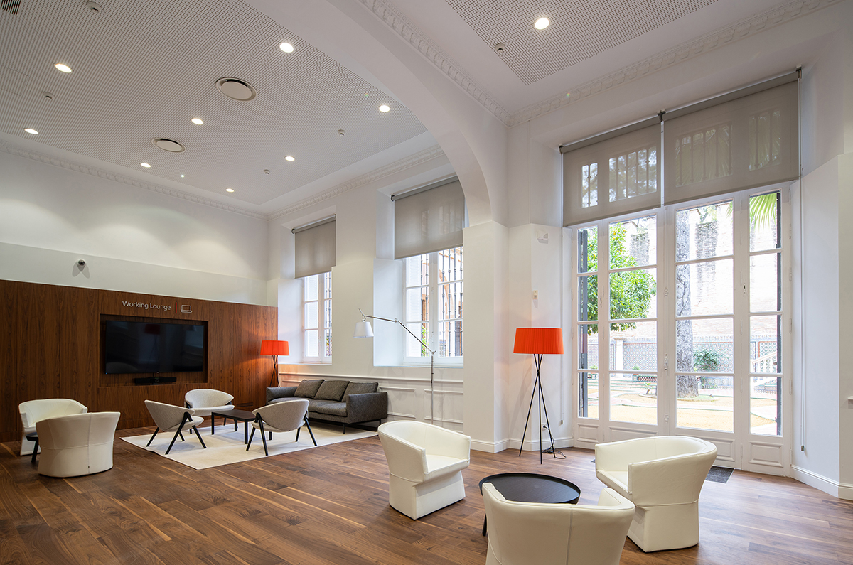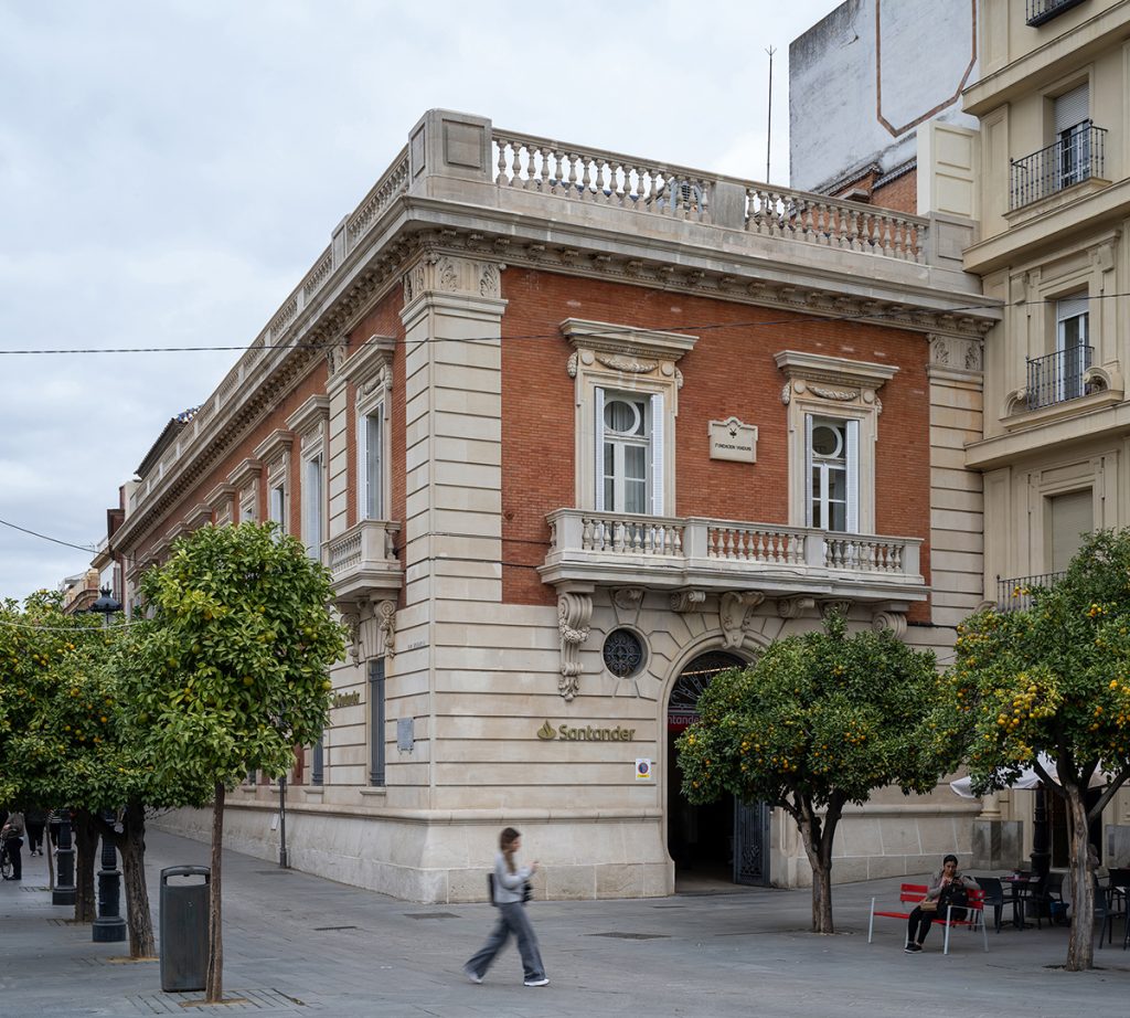 Uno de los principales desafíos del proyecto radica en la compatibilización entre la implantación de la imagen corporativa propia de una entidad bancaria y las condiciones patrimoniales singulares del edificio. Esta tensión se resuelve mediante una estrategia de intervención equilibrada, en la que los nuevos elementos se conciben como sistemas autónomos, reversibles y claramente legibles frente al soporte histórico.