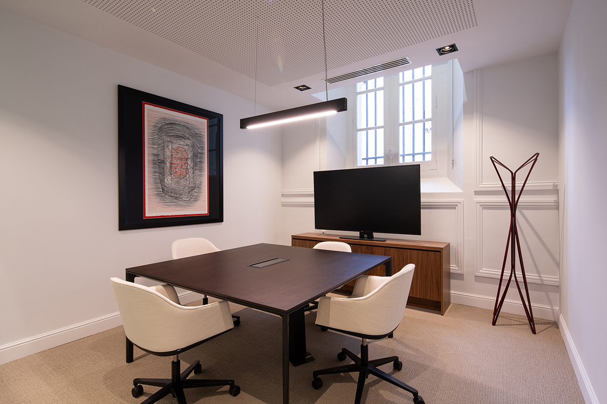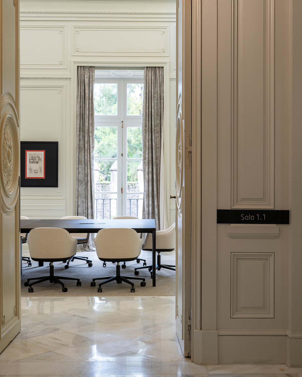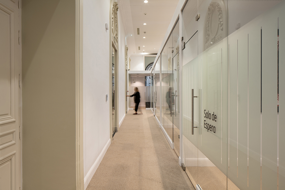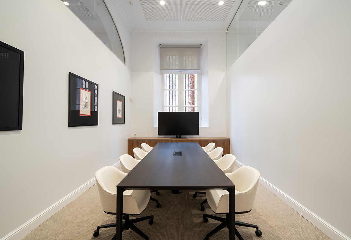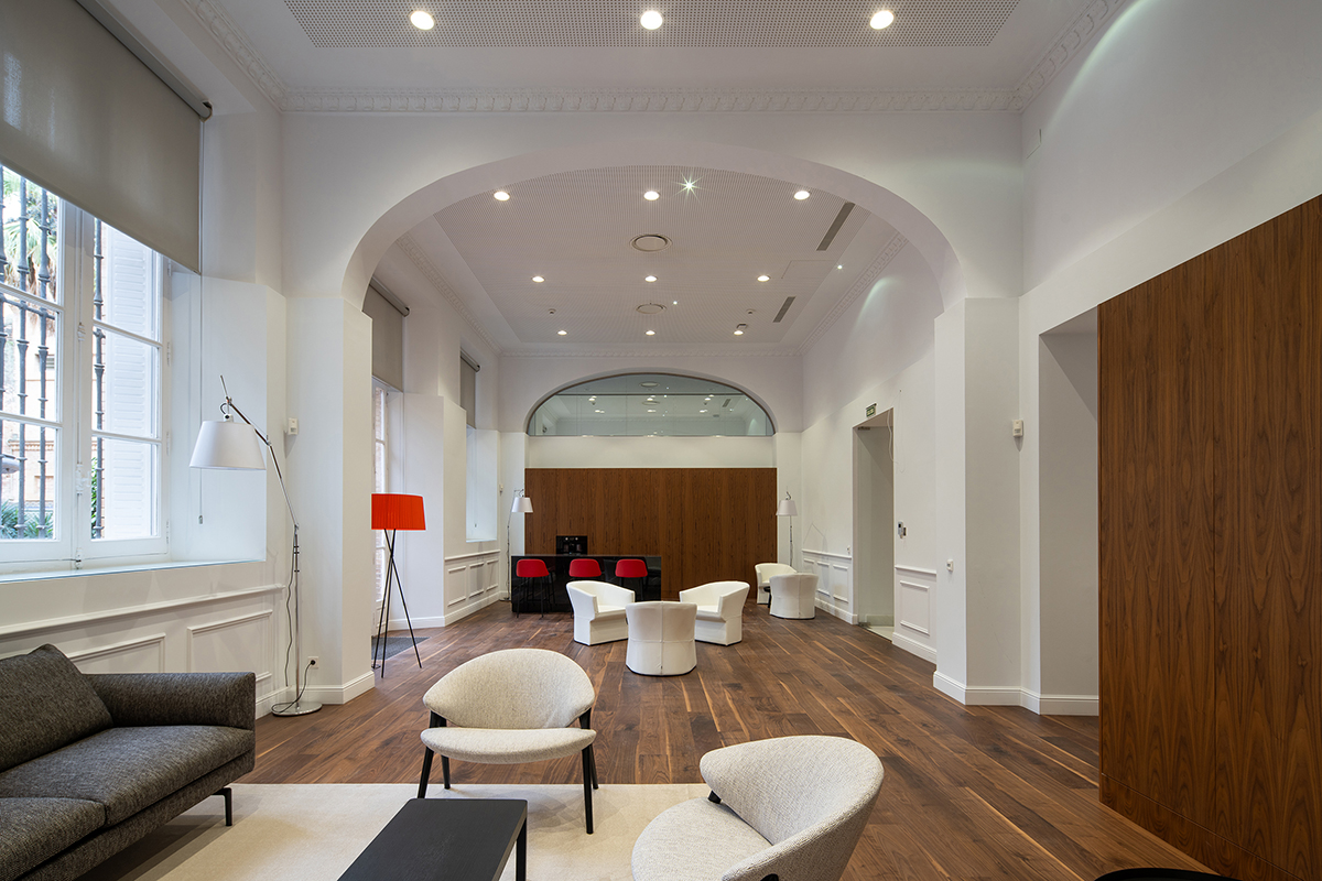 En planta baja, la operación adquiere especial complejidad al requerir la incorporación de espacios de reunión con elevados estándares de privacidad, en un contexto sometido a estrictas condiciones de protección patrimonial por parte de la administración competente. La solución adoptada se articula mediante la inserción de “cajas” funcionales, concebidas como piezas independientes dentro del espacio existente. Este recurso permite una intervención precisa y no invasiva, capaz de introducir nuevos usos sin alterar sustancialmente la espacialidad original, garantizando simultáneamente las condiciones de confort, aislamiento acústico y privacidad exigidas por el programa.
