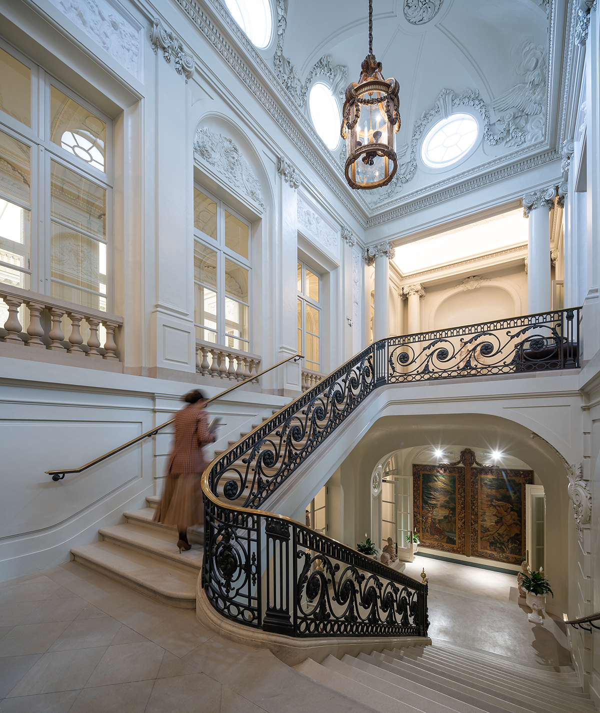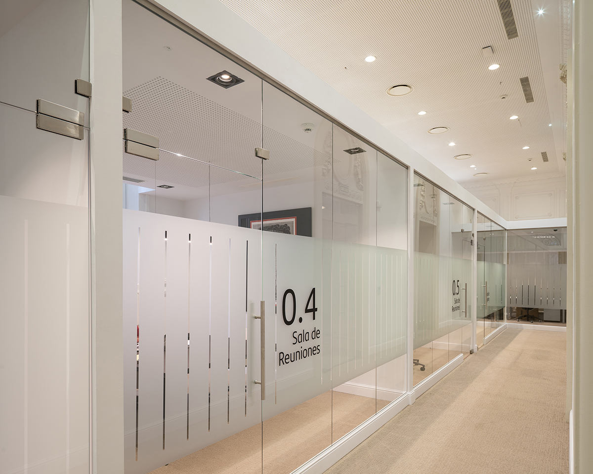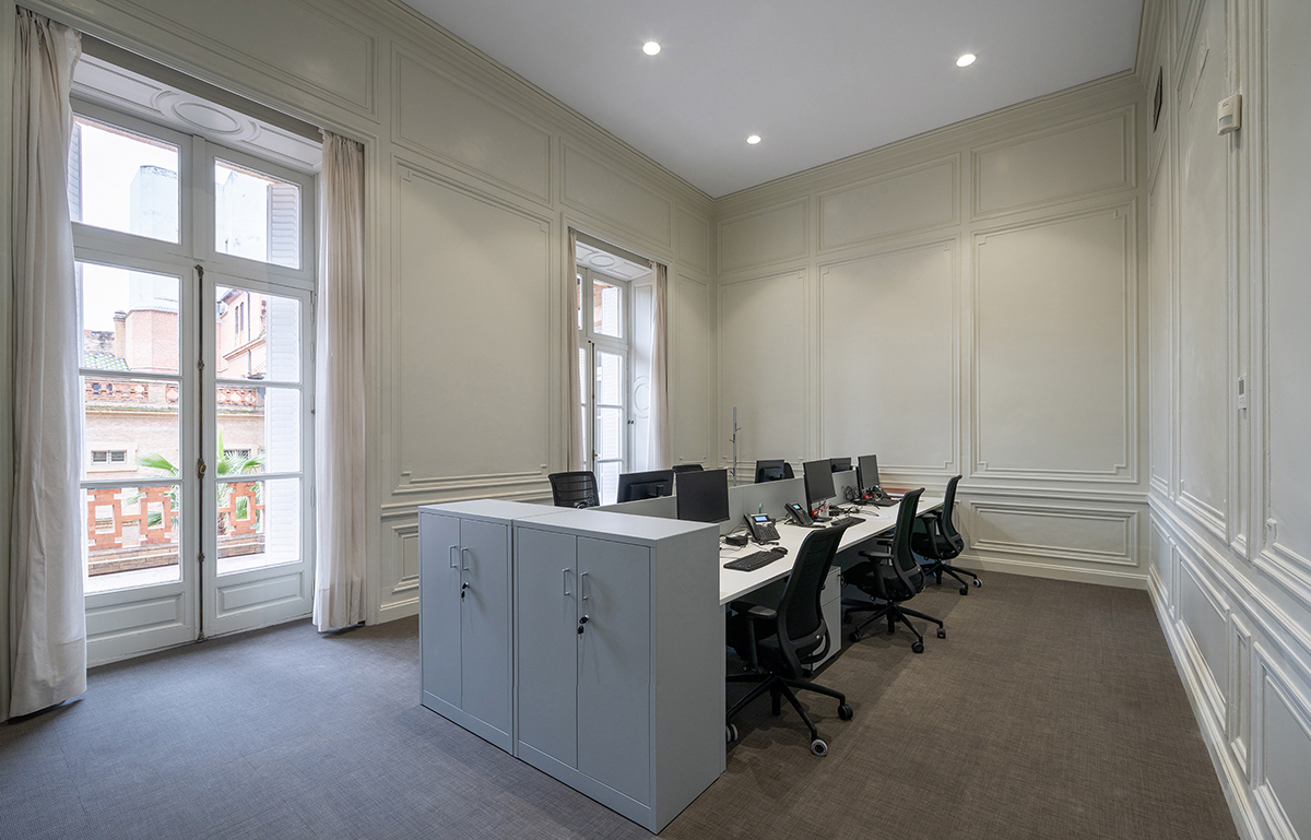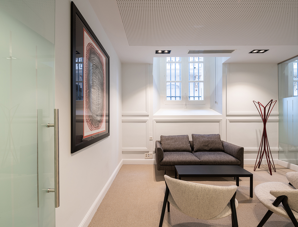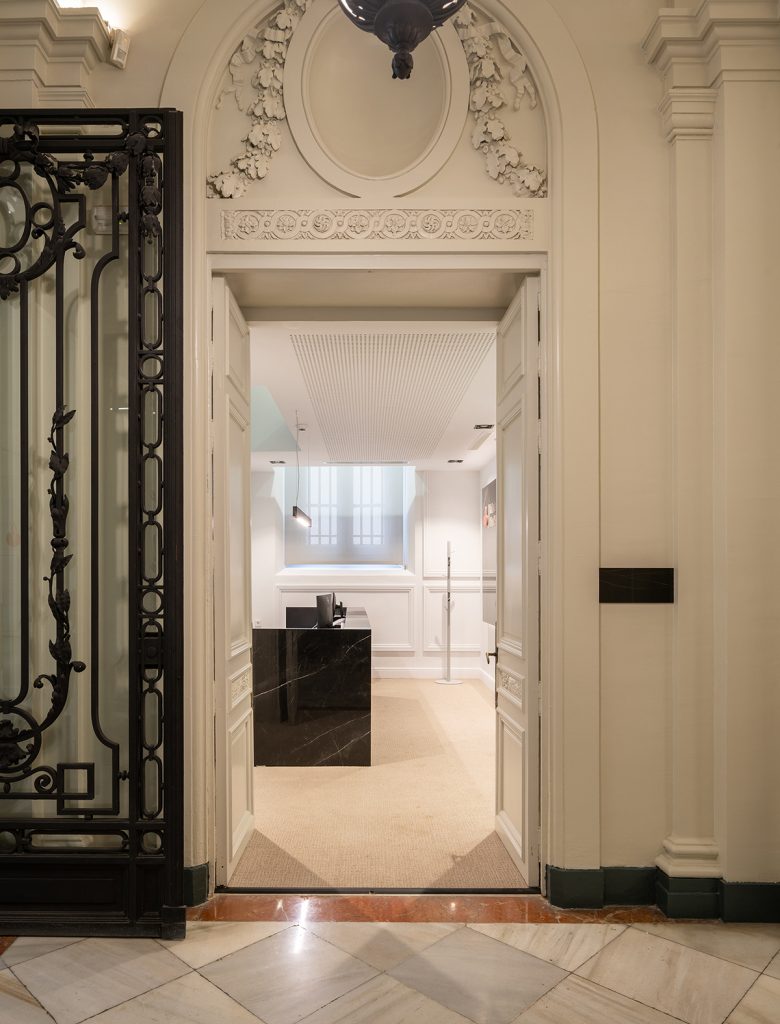 En planta baja, la operación adquiere especial complejidad al requerir la incorporación de espacios de reunión con elevados estándares de privacidad, en un contexto sometido a estrictas condiciones de protección patrimonial por parte de la administración competente. La solución adoptada se articula mediante la inserción de “cajas” funcionales, concebidas como piezas independientes dentro del espacio existente. Este recurso permite una intervención precisa y no invasiva, capaz de introducir nuevos usos sin alterar sustancialmente la espacialidad original, garantizando simultáneamente las condiciones de confort, aislamiento acústico y privacidad exigidas por el programa.